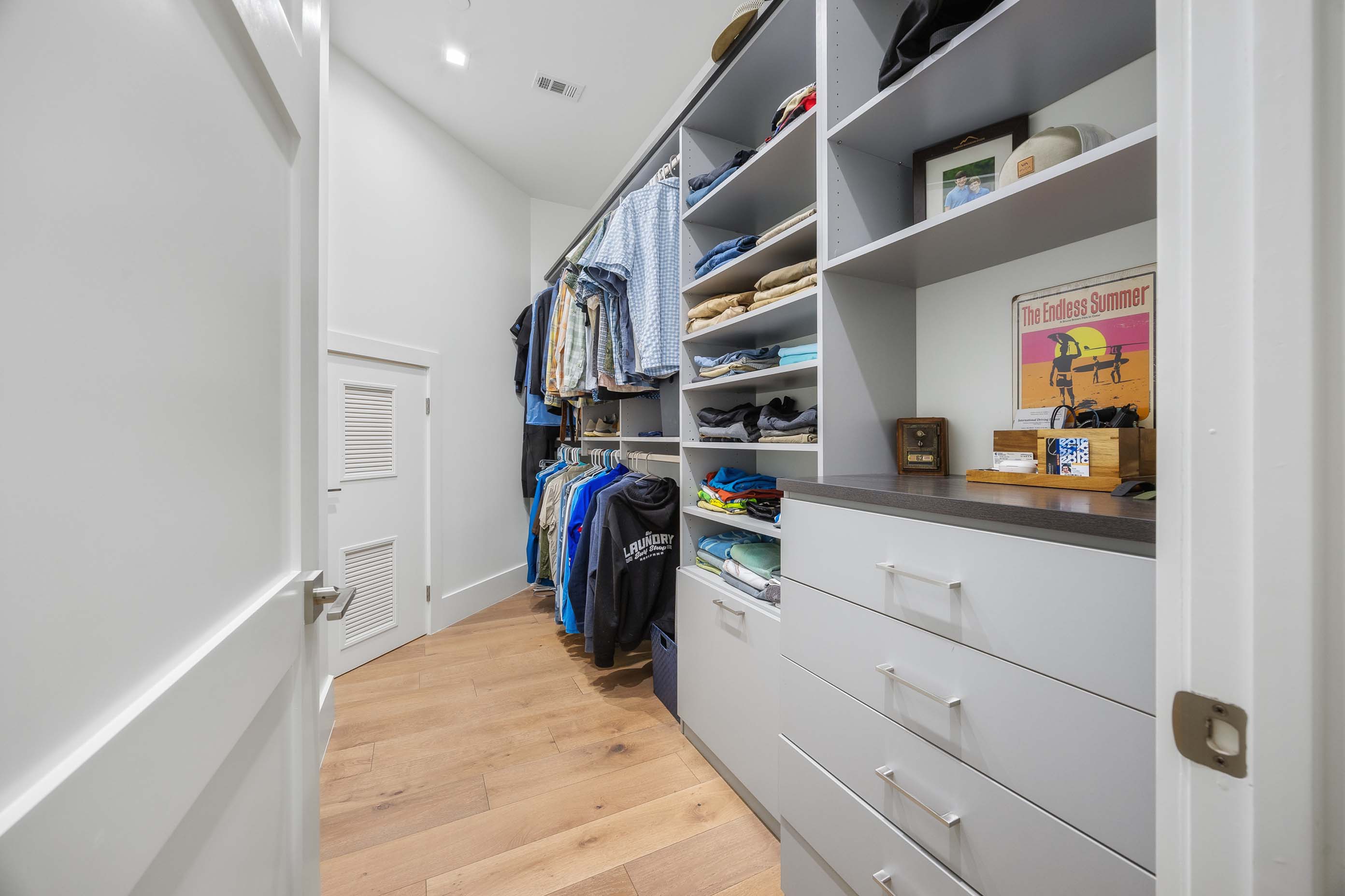 Primary bedroom on first floor with his-and-hers primary baths and closets